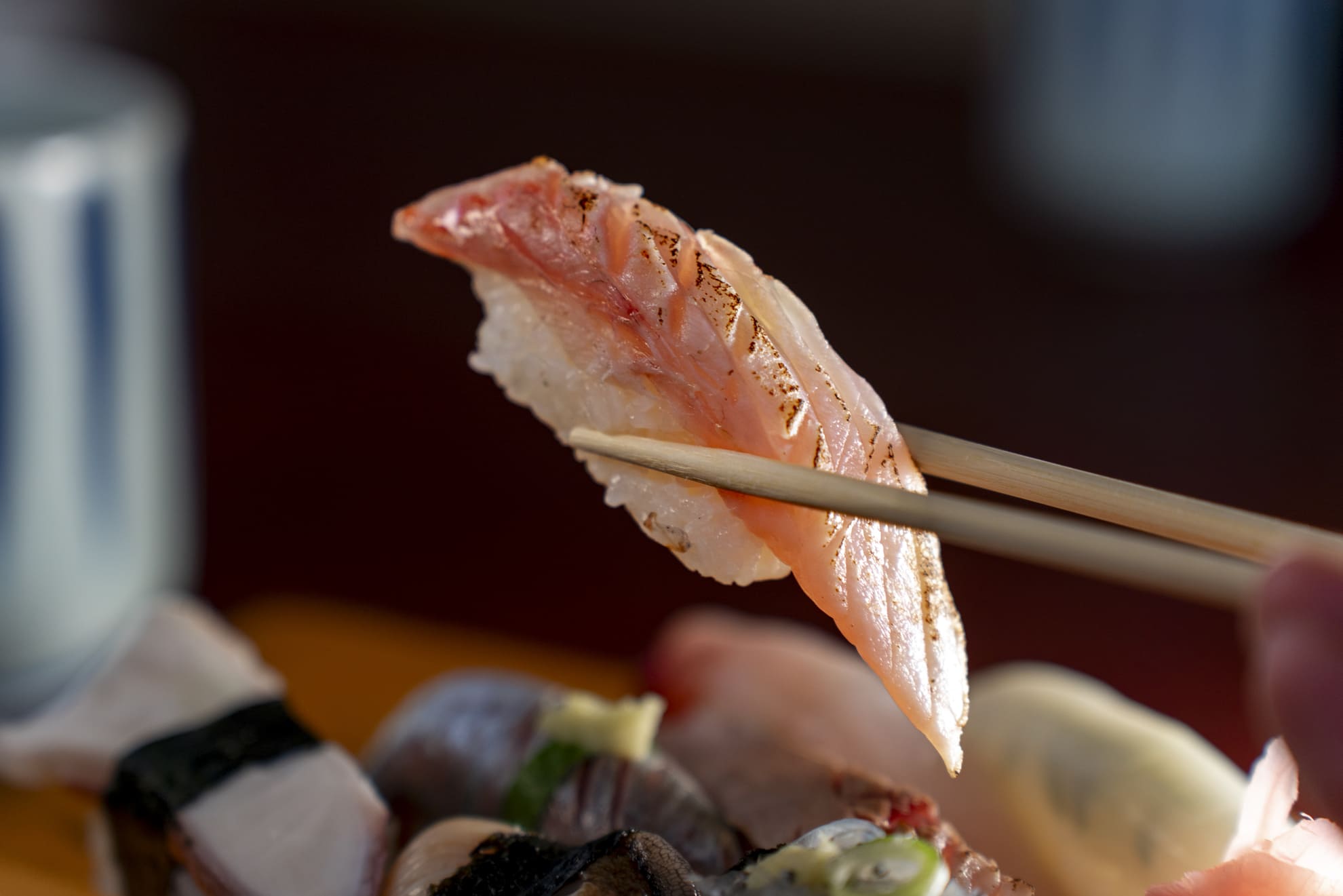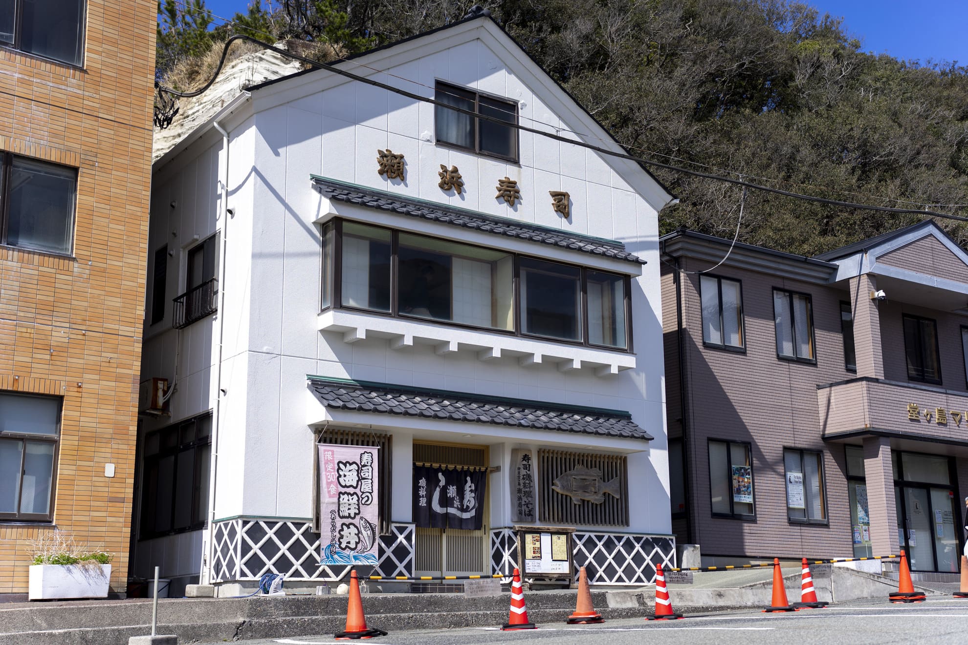 メインのネタは自分で毎朝仕入れた地魚で、天候にもよりますが常時10種類くらい準備しています。マグロはインドマグロを使用し、全部で25種類くらいのネタをご用意しています。玄関先には、毎朝仕入れた地魚の種類を表示する看板を設置しています。